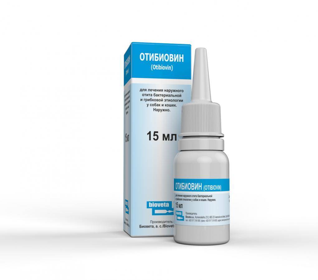 Отибиовин. Самое распространенное средство от отита для кошек на сегодняшний день. Производится в Чехии компанией Биовета. Считается препаратом широкого спектра действия, так как эффективен при лечении отитов бактериальной, грибковой и аллергической природы. Применяется также в качестве антибактериального средства при наличии в ушной раковине открытых ран и свищей. Что касается способа применения, то производитель настоятельно рекомендует перед закапыванием Отибиовина очищать ушной проход от выделений и корочек. Для этого можно ипользовать специальные препараты, которые за 2-5 минут до проведения процедуры заливаются внутрь. После уши массируются в области висков. Дальше питомец сам вытряхнет всю грязь. Остатки можно собрать салфеткой. Далее по 3-4 капли Отибиовина закапывают в каждое ухо минимум 2 раза в день в течение недели.