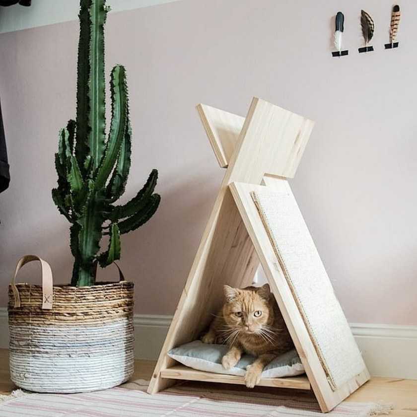В продаже представлен широкий ряд кошачьих лежанок в виде укромных домов. За основу таких изделий выбирают тонкую фанеру, которую в дальнейшем обвивают мягким ковровым покрытием.
