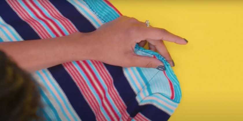 - Отрезаем горловину по линии плеч и с изнаночной стороны зашиваем отверстие горловины вручную.