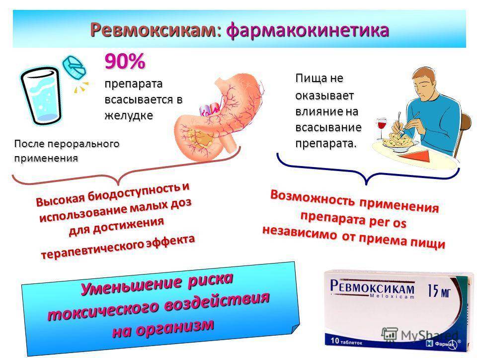 Российский препарат, содержащий в одной таблетке 7,5 или 15 мг мелоксикама. Быстро и практически полностью всасывается через ЖКТ в кровь и начинает действовать в течение 3-5 часов. Регулярное применение медикамента на протяжении более 1 года не влияет на его эффективность, но может привести к развитию опасных побочных состояний: