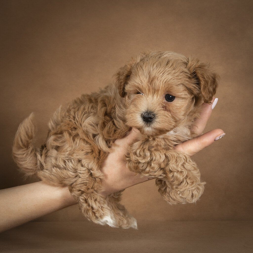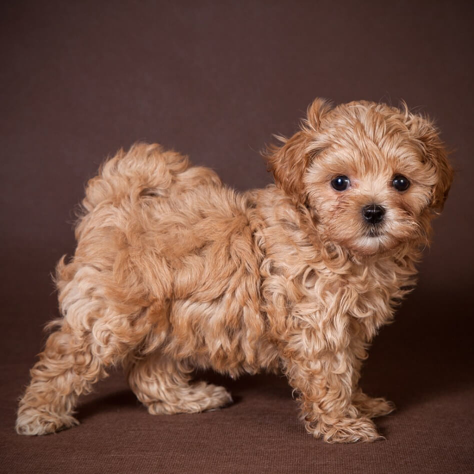 Мальтипу — это миниатюрная «плюшевая» собачка с игрушечной внешностью. На морде выделяются нос и выпуклые глаза, похожие на спелые вишни. Эти гибриды больше напоминают болонку, чем пуделя. От последнего они унаследовали мягкую курчавую шерсть.
