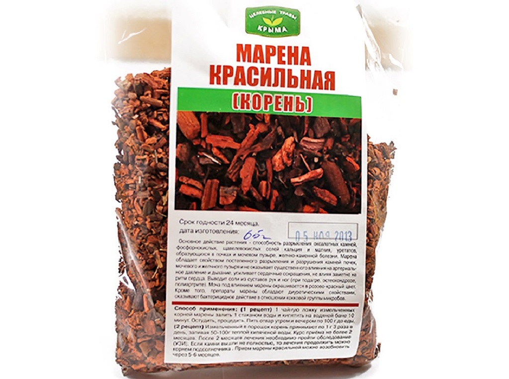 Экстракт марены красильной добывают из корней и корневищ растения. Уникальный состав, содержащийся в корнях, способствует измельчению и отхождению камней из почек. Сухой экстракт растения устраняет спазмы гладкой мускулатуры, активизирует мочегонный процесс. Способствует разрушению конкрементов, состоящих из частиц магния и кальция.