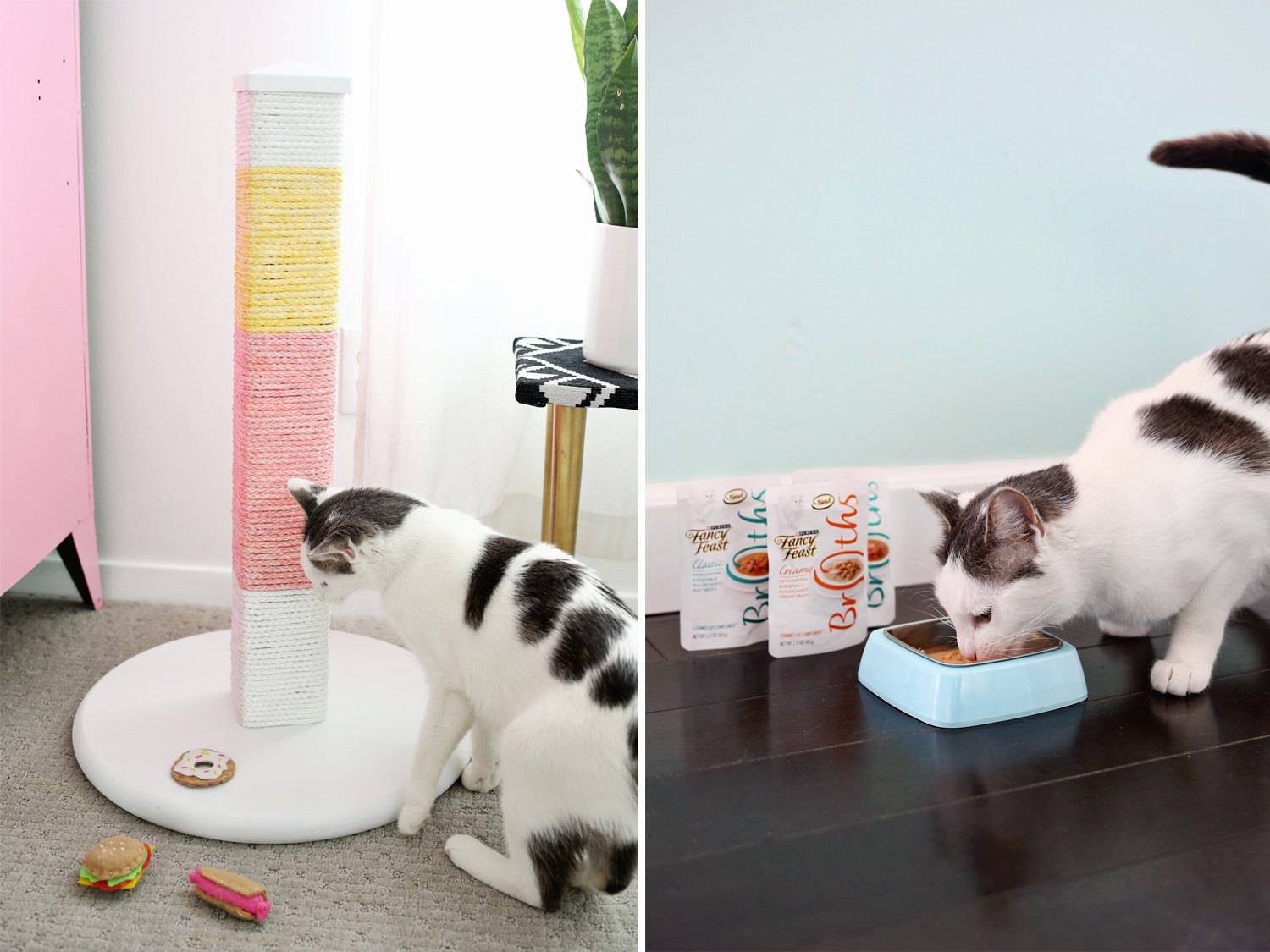 Дополнительные «устройства» для физических упражнений. Игривые коты нуждаются в месте, где можно выплеснуть свою энергию. Установите вместе с крытым домиком дополнительные столбы со столешницами, обвитые бечевкой. Такие домики можно встретить и в продаже в специализированных магазинах, но их стоимость может превышать допустимый семейный бюджет семьи. Их легко сделать самостоятельно из фанеры и прочих стройматериалов.