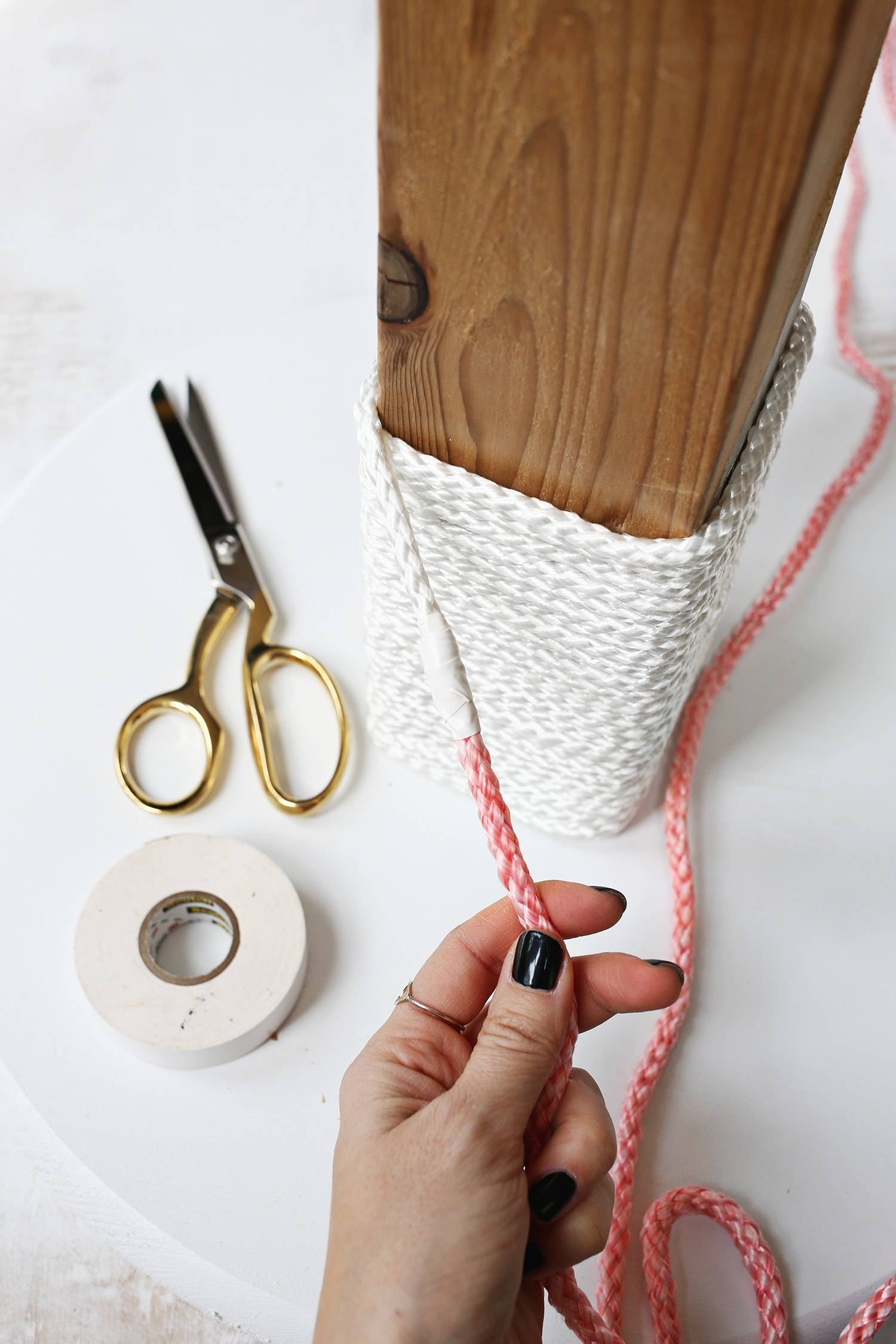 Столбики, обернутые веревкой – это один из наиболее популярных видов таких приспособлений. Если сомневаетесь, чем обмотать приспособление, то лучше используйте натуральный шпагат. Вот краткий мастер-класс пошагово: