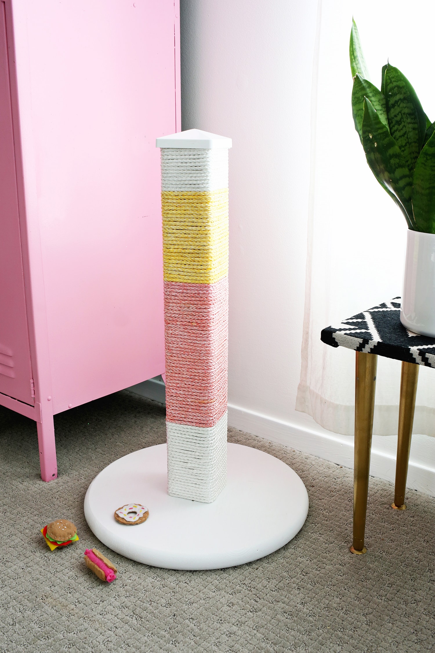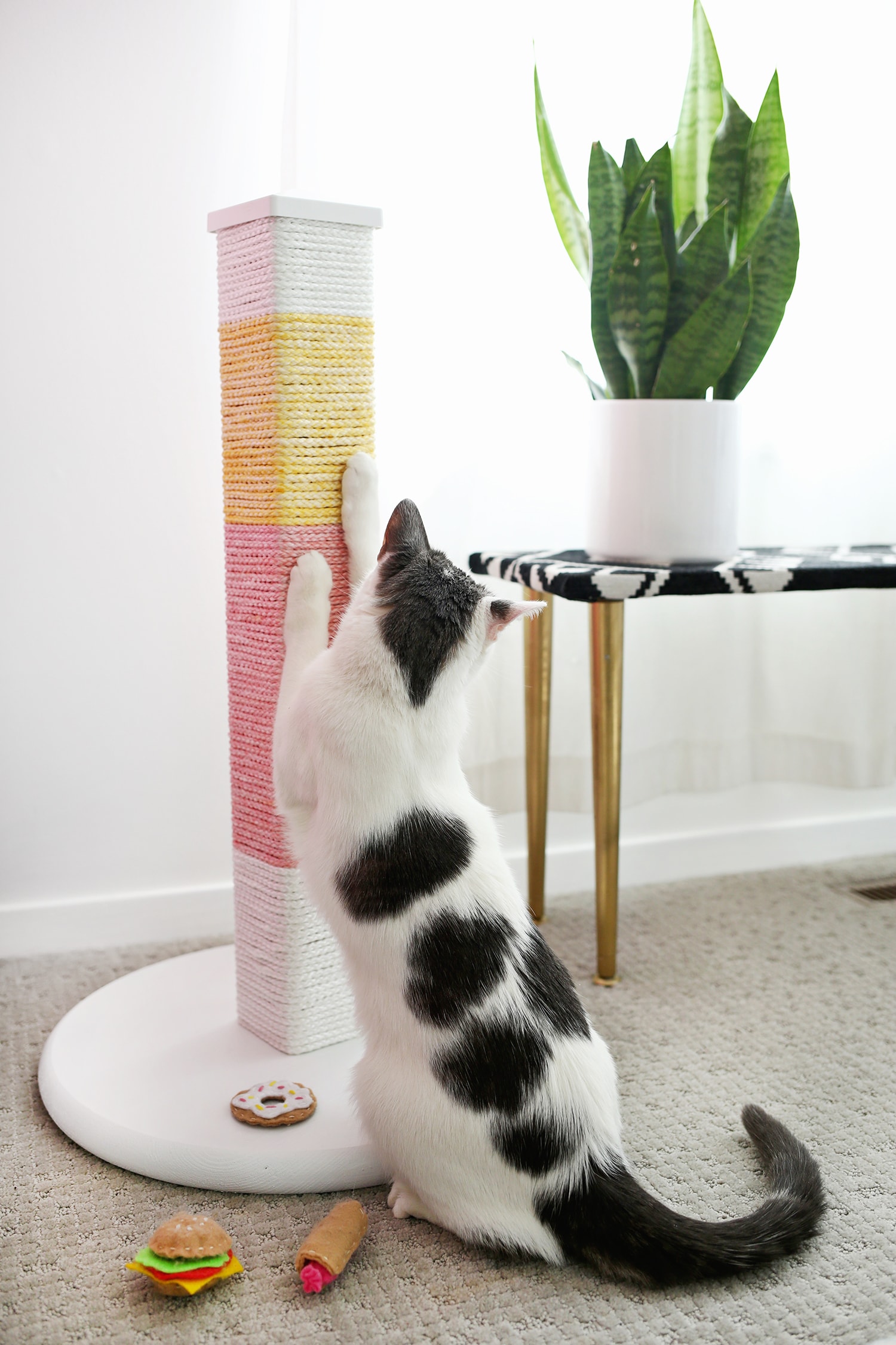 Чтобы такая когтеточка выглядела интереснее, можно установить сверху лежанку либо прикрепить какие-то игрушки, чтобы заинтересовать котика.