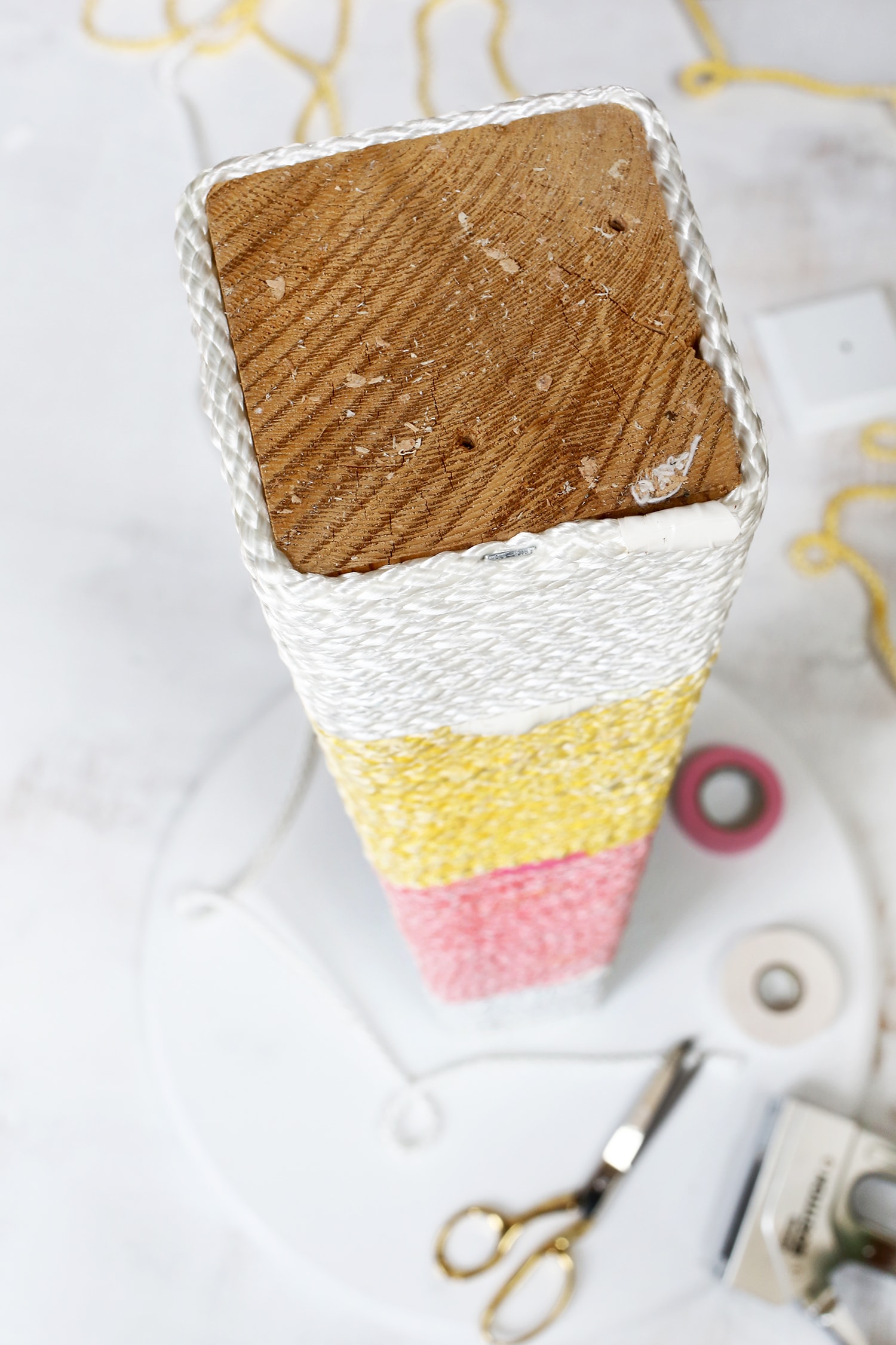 Просушите веревки и плотно оберните их вокруг ствола в определённой цветовой последовательности, закрепляя степлером.