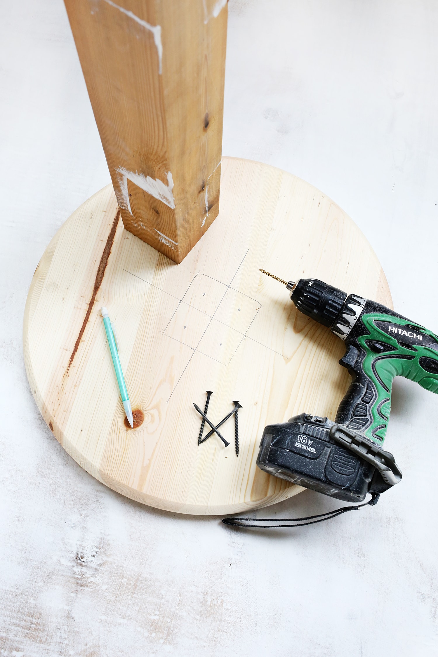 Делаем замеры, определяем центр для стойки. Начертите границы карандашом. Просверлите четыре отверстия для шурупов (возьмите сверло немного меньше самих шурупов).