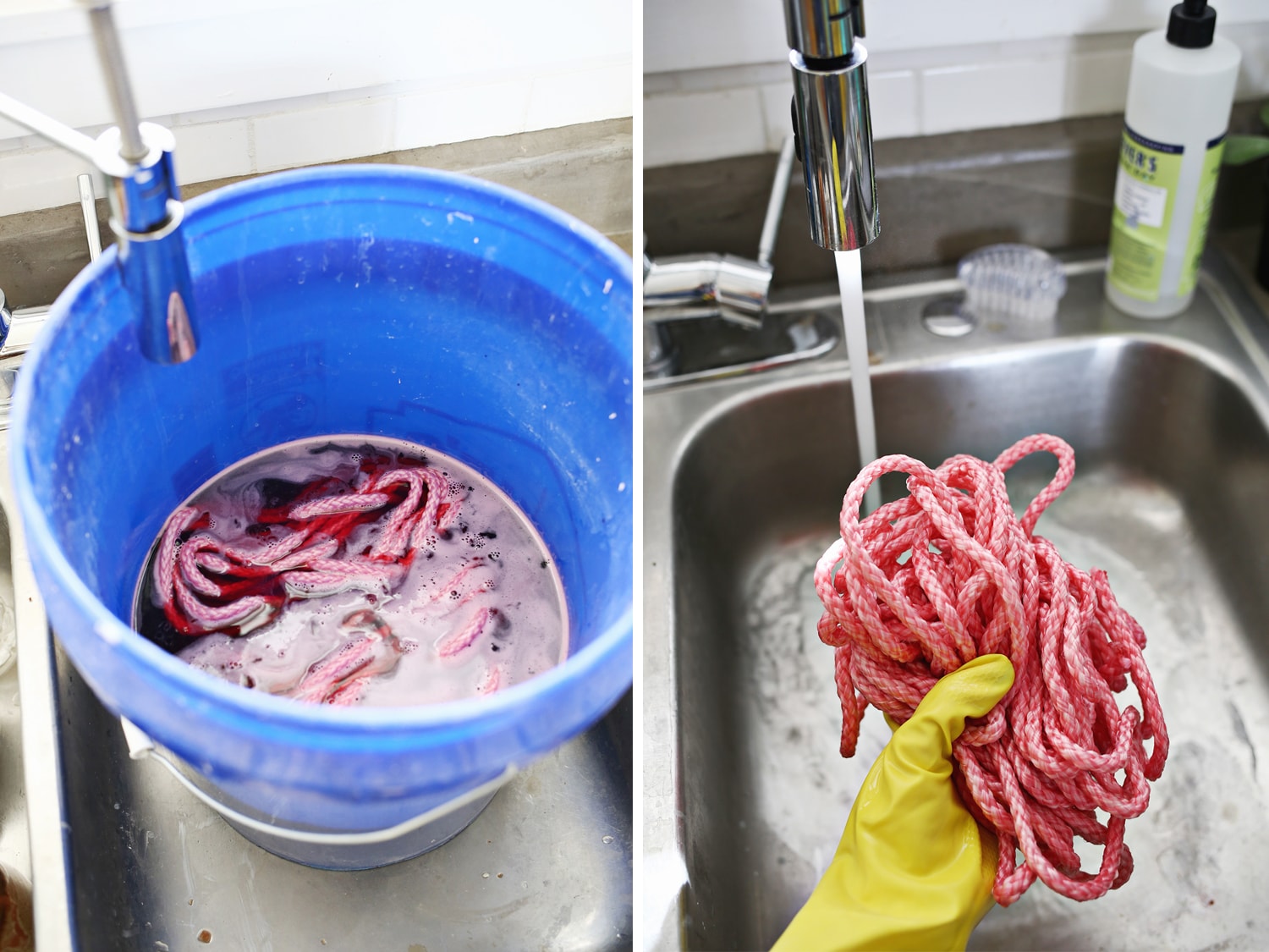 Хорошенько промойте веревку в прохладной воде от излишков краски. Аналогично проделайте с другими цветами.