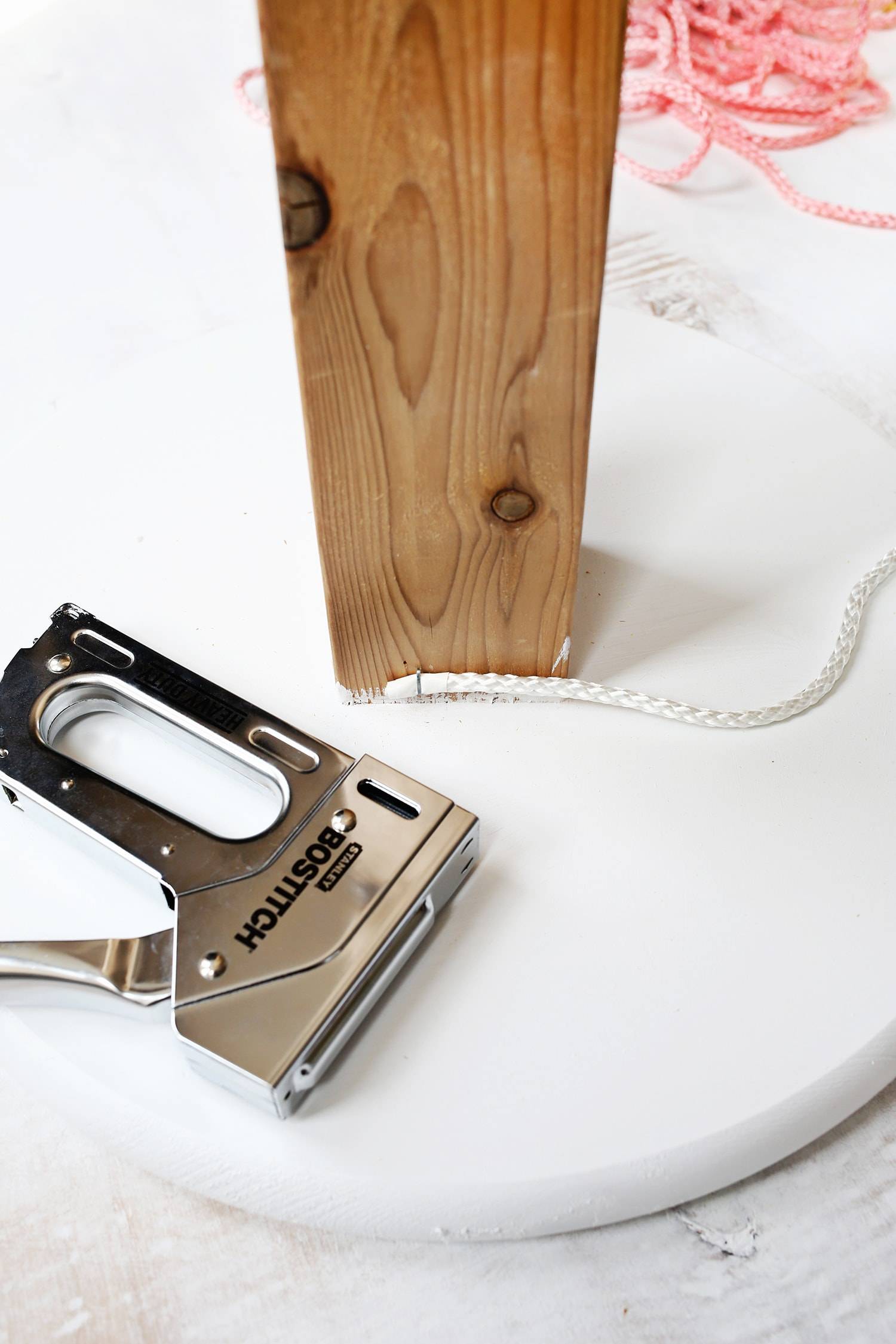 Расходные материалы: круглая деревянная основа для платформы, деревянный столб, шурупы, дрель, крышка для верхушки, цветная краска, нейлоновая веревка, степлер (или молоток с гвоздями).