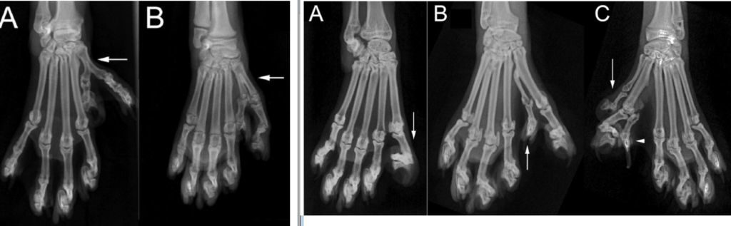 У животных возможны проблемы с ростом когтей, кончики затрагивают главные пальцы или растут в сторону, внутрь подушечки. При этом ногти ранят мягкие ткани.