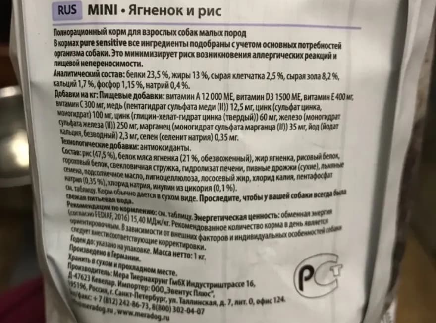 Ознакомимся с составом корма MERA Pure Sensitive на примере варианта Mini Lamb & Rice (для взрослых собак малых пород, с ягненком и рисом):
