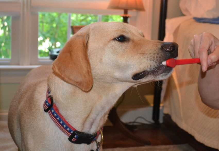 Чистка зубов. Домашние питомцы не имеют возможности самостоятельно почистить зубки о твердые предметы, что приводит к образованию зубного камня и развитию патологий ротовой полости. С 2-х месячного возраста щенков приучают к регулярной чистке зубов ветеринарной пастой. Кроме того, полезно давать собакам сахарные говяжьи кости и функциональные лакомства из бычьих жил.