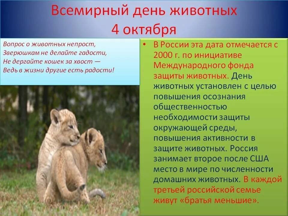 - Другие названия: Всемирный день защиты животных, Всемирный день охраны животных