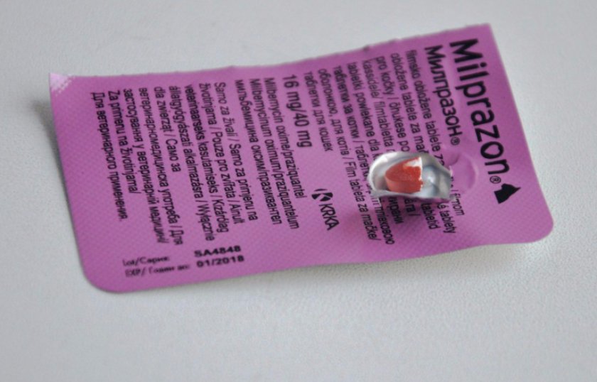 Препарат предназначен для профилактической и лечебной дегельминтизации. Таблетка отличается привлекательным вкусом, однако привередливым псам приходится давать ее насильно, на корень языка. Милпразон защищает питомца от повторной инвазии ленточными и круглыми паразитическими червями на 90 дней.
