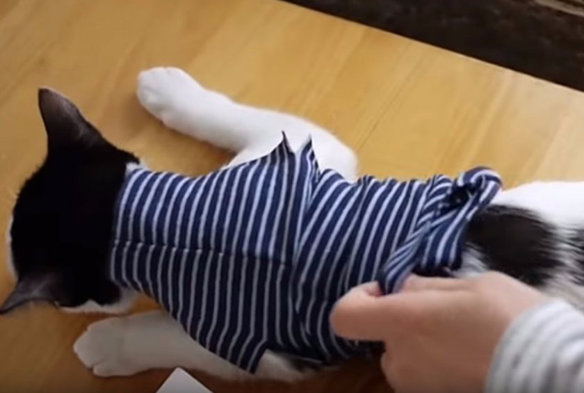 примеряют изделия на кошку. Следует проверить, не тесно ли ей в таком наряде. Для этого под носок просовывают ладонь. Если рука входит свободно, наряд пошит по размеру. Так же проверяют область горловины.