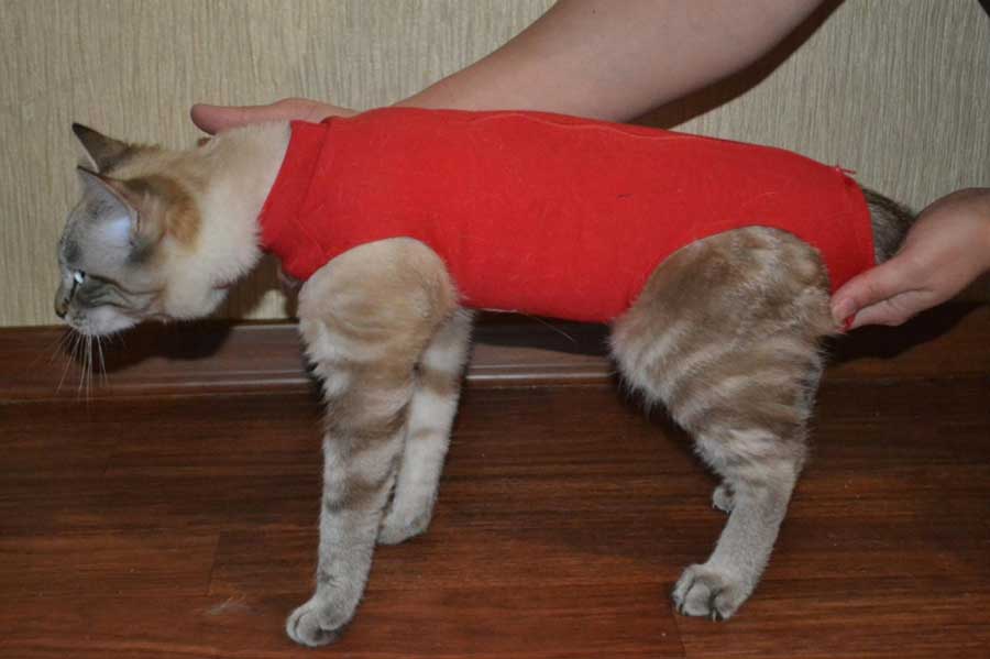 Такой бандаж не позволяет питомцу вылизывать прооперированное место. Язык этих пушистых животных очень шершавый. Поэтому он способен повредить швы, открыв рану. Кошачья слюна считается природным антисептиком. Но в ней содержится большое количество бактерий, некоторые из которых способны спровоцировать воспаление. Попона является отличной защитой от этих двух факторов риска.