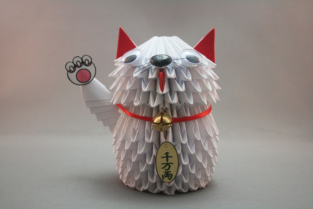 Модульная кошечка на полке выглядит привлекательно и неординарно. Для начала можно сделать домашнего питомца в виде вытянутой вазочки с хвостиком и ушками. Заранее готовятся 1016 белых модулей и 129 любого другого цвета для визуализации животика.