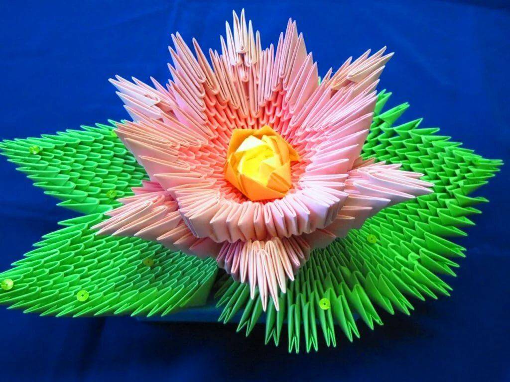 Модульный лотос из треугольников собирается немного сложнее, но при этом он получится более объёмным и изящным. Заранее нужно заготовить 878 модулей: жёлтых и зелёных по 294, ярко-зелёных – 140 и розовых – 150.