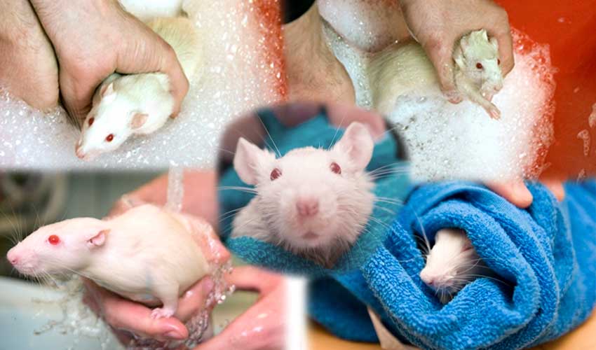 Нужно помассировать шерсть крысы, при этом использовать щетку для очень загрязненных участков кожи. После чего необходимо тщательно смыть шампунь и загрязнения с шерсти крысы, чтобы избежать их попадания во внутрь, поскольку крыса потом будет вылизываться.