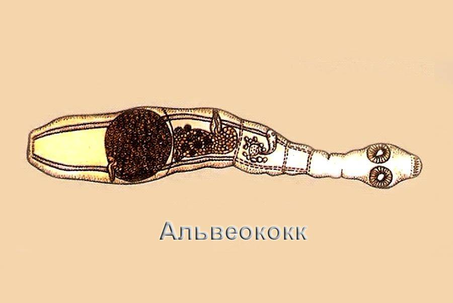 Проникнув в кровеносные сосуды, личинки с кровью разносятся по всему организму, скапливаясь в отдельных органах, чаще всего в печени. На месте их скопления образуется постоянно растущая киста, которая может достигать до 30 см в диаметре. Лечение альвеококка только оперативное — кисту удаляют хирургическим путём, но на любой стадии болезни человек не опасен для окружающих, заразиться от него невозможно.