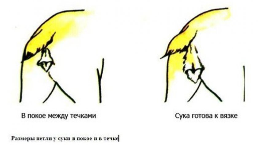 Через полторы-2 недели у собаки изменяется структура выделений, они будут похожими на слизь желтоватого цвета. В этот период самка ощущает сильное половое влечение, особенно если замечает поблизости кобелей, ее хвост отодвигается в сторону, а тело принимает нужную для полового акта стойку. Петля значительно увеличивается в размерах.
