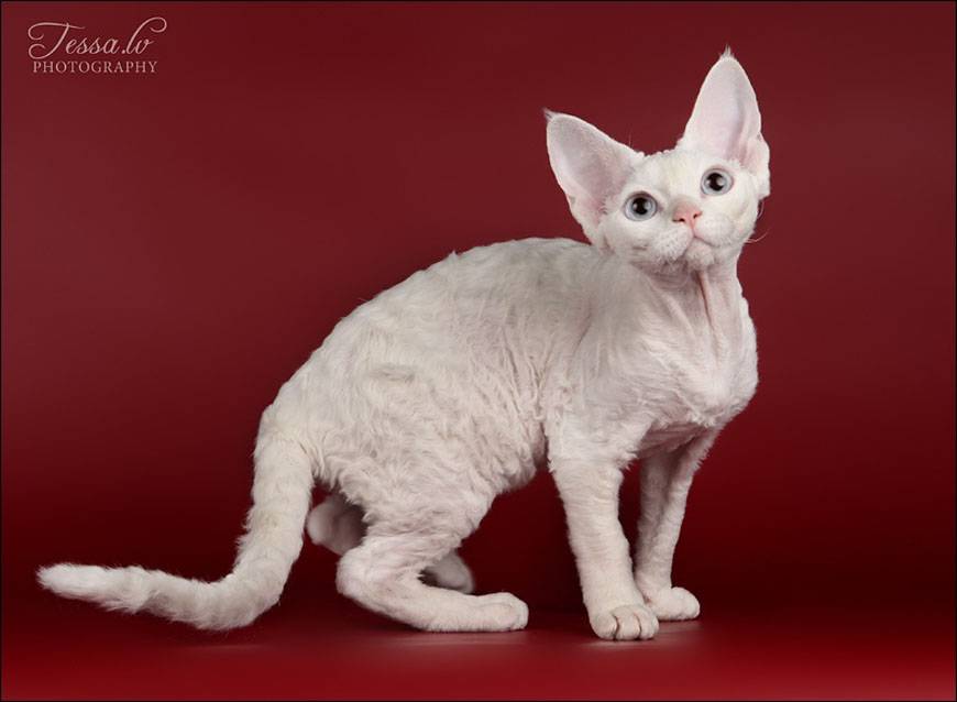 Порода кудрявых кошек родом из графства Девоншир отличается не только огромными круглыми глазами, но и достаточно эксцентричной внешностью — голова в форме треугольника, венчающаяся большими ушами, крепкое, мускулистое телосложение, и конечно же нежная волнистая шёрстка.