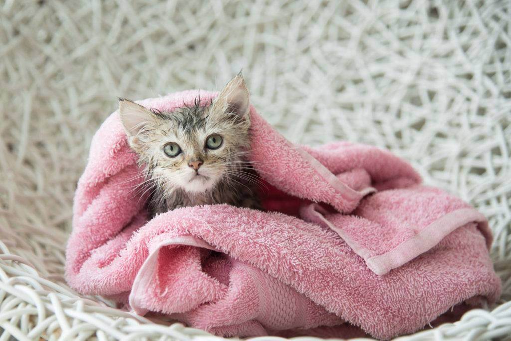 Чистого котенка сразу после водных процедур вытирают махровым полотенцем, а затем заворачивают в сухое и мягкое, чтобы питомец не простыл. После этого животное должно оставаться в теплом помещении минимум 12 часов, выпускать его на улицу нельзя.