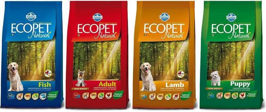 Линия Farmina Ecopet Natural Cibau также относится к разновидности Premium. Основой такого корма служит белок. В зависимости от вида, в смесь входит ягненок, курица, рыба. Дополнительные ингредиенты: рис, кукуруза, рыбий жир. Такой корм можно использовать для собак любого возраста. Он отлично переваривается и усваивается животным.