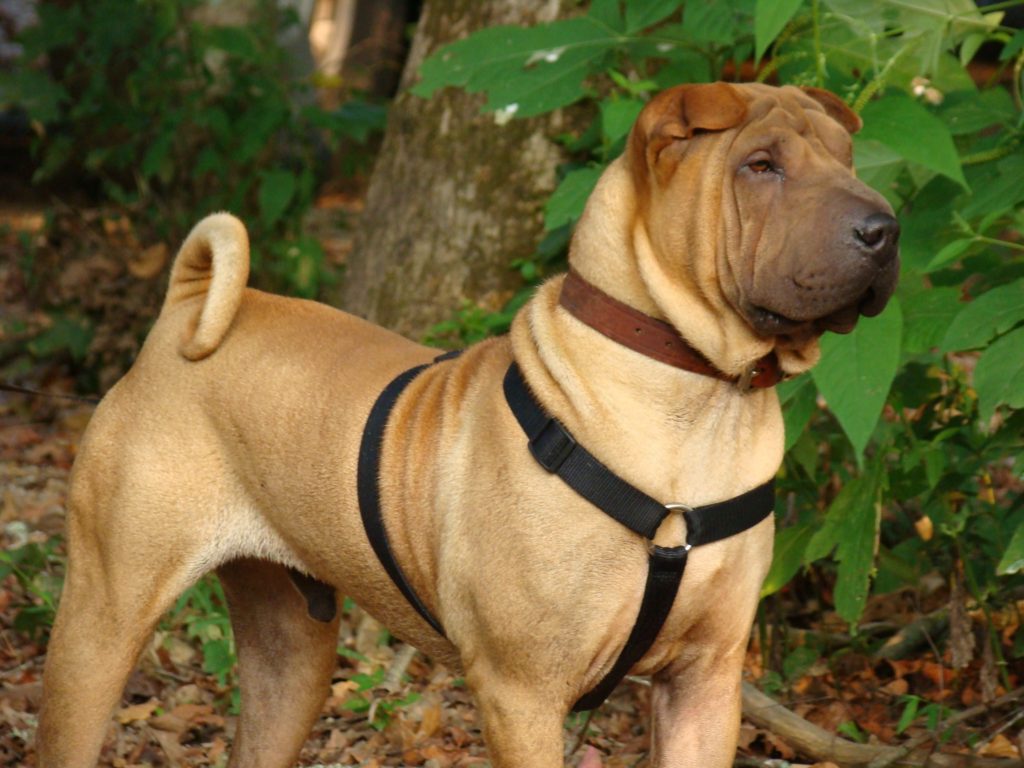 - Бладхаунд. Эта порода очень похожа на шарпея. Отличительной чертой являются висячие уши и прямой хвост. Окрас шерсти чёрный с желто-коричневыми пятнами, красно-коричневый или сплошной ярко-рыжий. Шерсть жёсткая и короткая. Характер добродушный и добрый без агрессии.