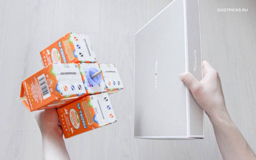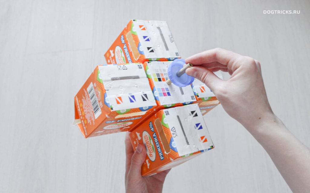 Если у вас есть много свободного времени и желание, можно соорудить совсем серьезную конструкцию — спиннер. Суть игры будет заключаться в том, что собака вращает спиннер носом и из него при этом вылетает еда.