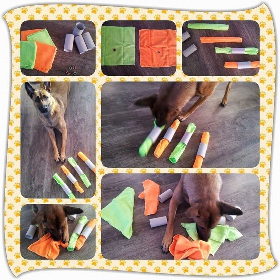 Обычные тканевые салфетки, втулка от туалетной бумаги и любимое лакомство вашего питомца – вот что нужно, чтобы сделать ещё одну игрушку для развития пытливого ума собаки.