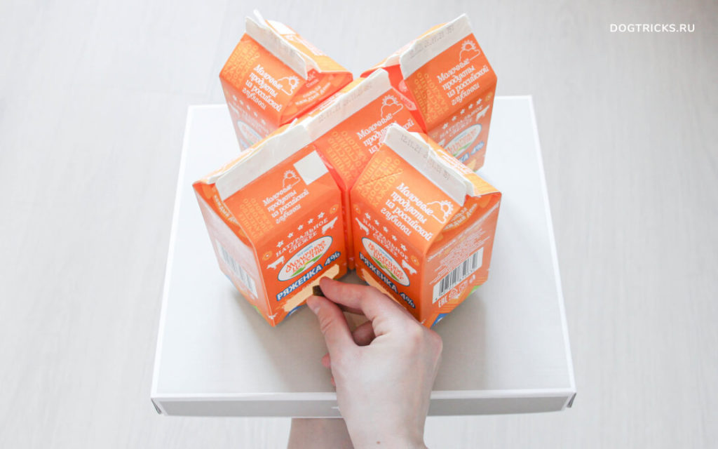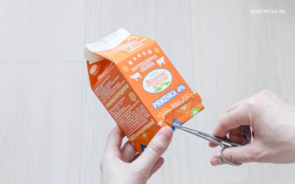 Если ваш любимец не склонен к проглатыванию несъедобных предметов, вы можете заменить фирменный конг на стаканчик из-под йогурта подходящего размера. При первом знакомстве рекомендую держать его в руках, чтобы подсказать собаке, что смысл игры именно в вылизывании лакомства, а не в разгрызании предмета.