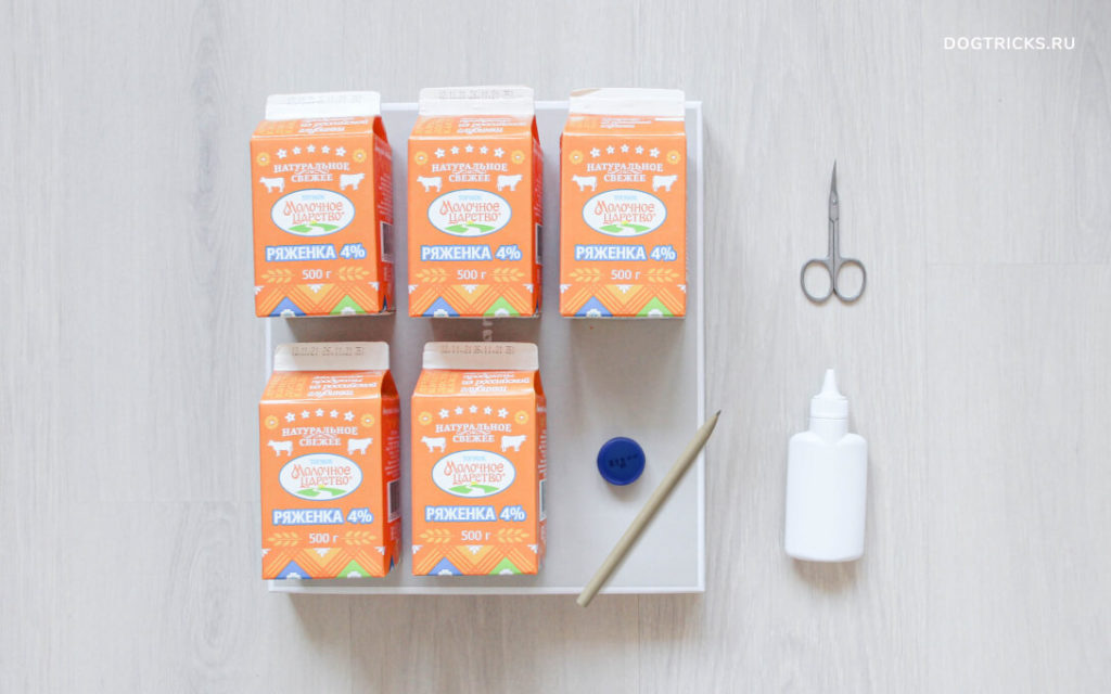 Шаг 1. Возьмите плоскую коробку, 5 одинаковых пакетов из-под молочных продуктов (или аналогов, например, мини-тубы из-под чипсов), ножницы, клей, 1-2 пластиковые крышки, ручку (или палочку).