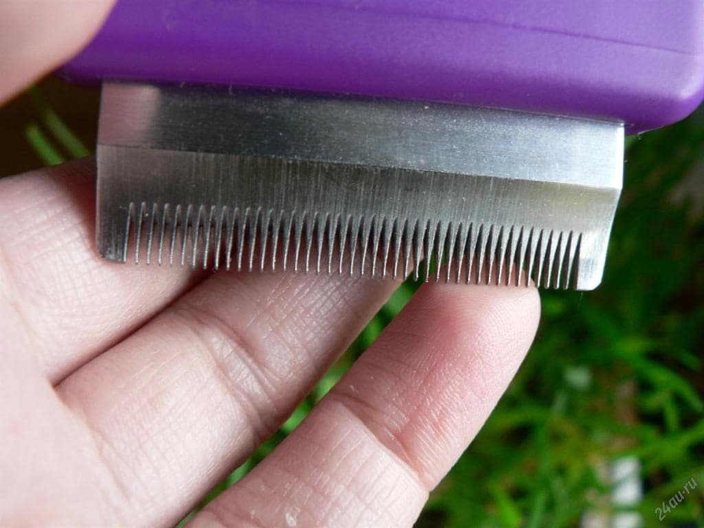 Эта расческа работает по такому же принципу, что и триммер, устраняя с питомца лишнюю шерсть и не оказывая отрицательного воздействия на здоровые волоски. Благодаря зубчикам выпавшие волосы прочно фиксируются и извлекаются наружу. Та часть шерсти, которая осталась на животном, обрезается острыми лезвиями, расположенными между зубьями.