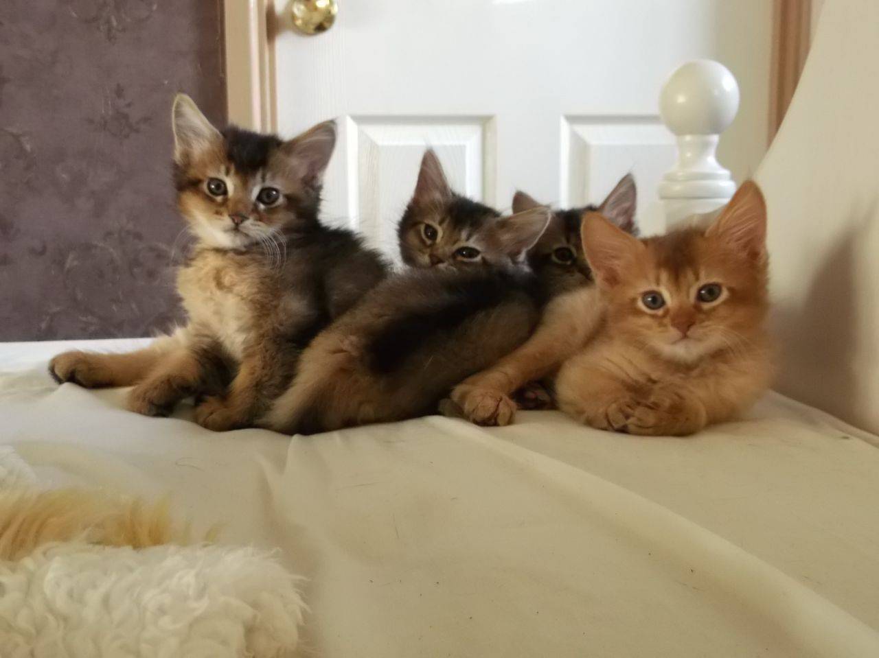 После удачной вязки начнется период беременности. Он длится около шестидесяти пяти дней. У сомалийской кошки обычно рождается до четырех котят. Однако бывало, что рождалось сразу шесть котят. Пока это рекордное количество. Котята рождаются очень яркими и сохраняют свой окрас и во взрослом возрасте.