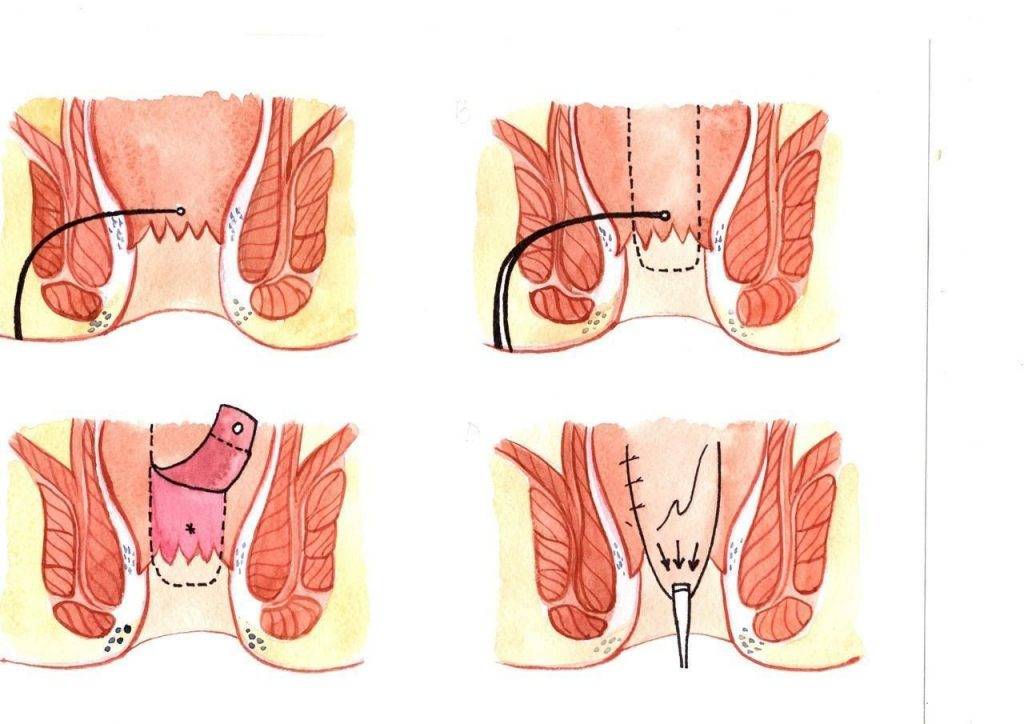 При высоких или рецидивных свищах применение вышеуказанного метода рассечения свища недопустимо из-за риска развития недержания кишечного содержимого или газов в результате повреждения большого объема мышечного массива. Вместо этого свищевой ход высекается в виде трубочки в пределах здоровых тканей. При этом в стенке прямой кишки образуется дефект, который закрывается небольшим участком слизисто-подслизистой оболочки кишки так называемая пластика перемещённым лоскутом (Рис.6).