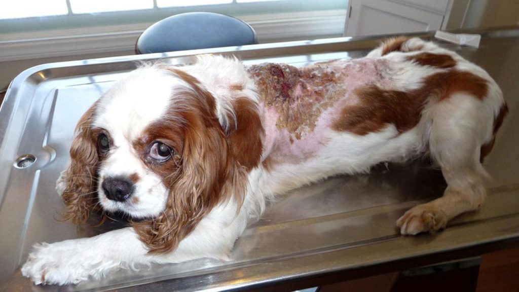 Тяжелые ожоги причиняет открытое пламя, так как происходит воздействие от трех факторов – раскаленных частиц, попадающих на кожу и шерсть, теплового излучения и горячего воздуха. Если воспламенилась шерсть, то пока она не будет погашена, на кожу будет оказываться воздействие, поражающее не только верхние слои, но и более глубокие – подкожная клетчатка, а иногда и мышцы, кости. Ожоги от открытого пламени – самые тяжелые и часто приводят к болевому шоку и смерти животного.