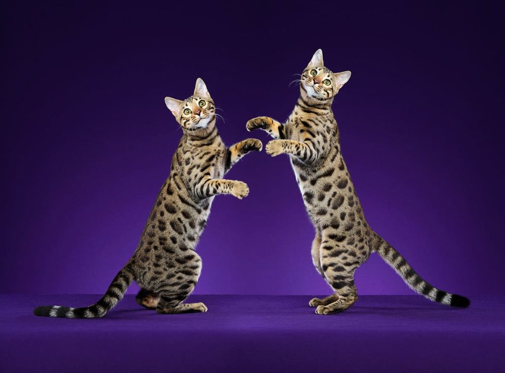 При создании этой кошечки было использовано более 7 разновидностей котов, но красивый узор достался ей от мау. Помимо шелковистой шубки, она примечательна необычным расположением лап относительно корпуса. Они находятся под прямом углом, поэтому во время любого движения создается ощущение, что животное подкрадывается к своей жертве как настоящий хищник.