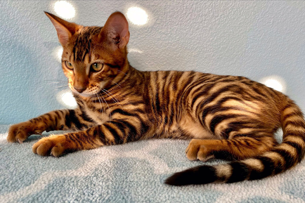 Этот родственник Бенгала похож на тигра в миниатюре благодаря четким черным полосам, пересекающим поперек туловище животного. Блестящий мех по текстуре напоминает плюш. Характер спокойный, выдержанный.