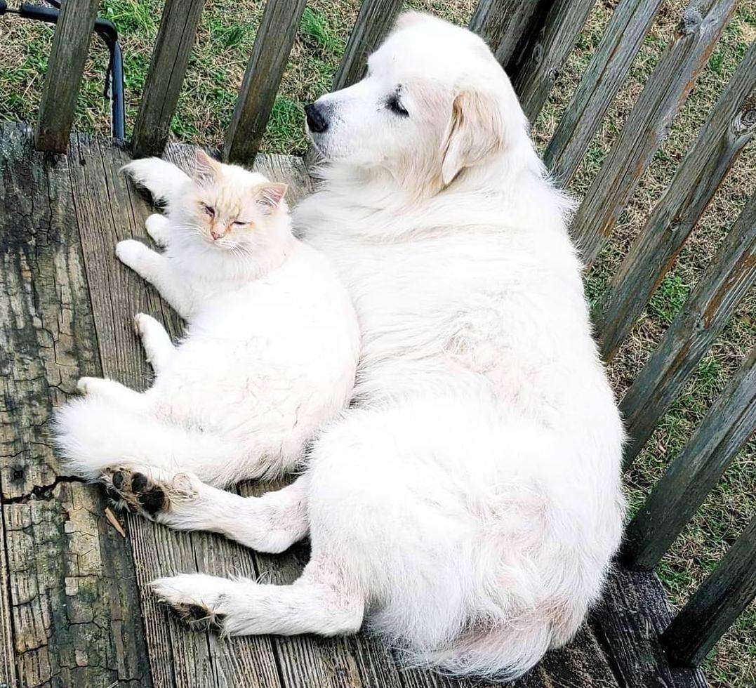 Примерно так же эти собаки ведут себя по отношению к другим, более мелким домашним животным. Особо дружны, как ни странно, с котами. У пиренейцев не бывает приступов агрессии. Они всегда спокойны и уравновешены. Эти большие, добродушные, лохматые и похожие на белого медведя собаки, тем не менее, ярые защитники своей территории и ее жителей.