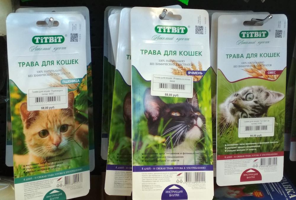 В специализированных зоомагазинах можно купить миниатюрные емкости с травой. Неудобство заключается в том, что для кошек подходят только свежие стебли. Нежная растительность быстро вянет, и придется покупать новую. Гораздо экономичнее и удобнее выращивать лакомство для питомцев дома.