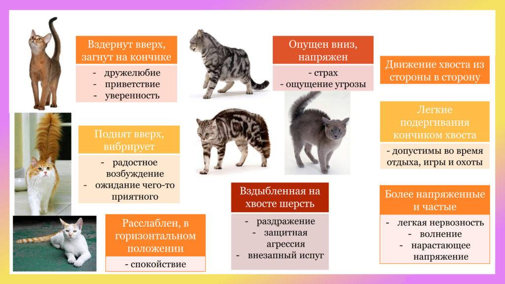 Хвост взлетает вверх – кот просто взволнован Вашим приходом, медленные взмахи хвостом – легкое раздражение, застывший опущенный хвост – отвращение и разочарование, легкое пошевеливание кончиком – интерес, подергивание напряженным хвостом – предостережение.