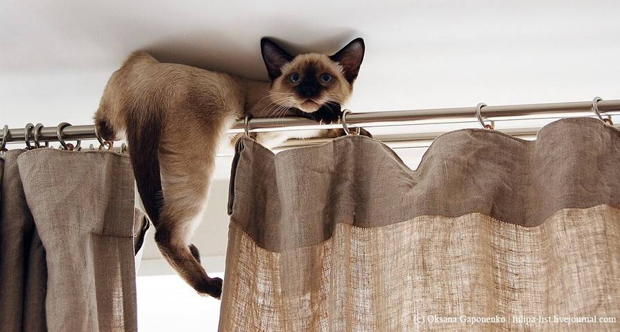 - закрепите шторы таким образом, чтобы они упали сразу, как только животное на них залезет, – после нескольких падений кошка сама поймет, что это небезопасное занятие;