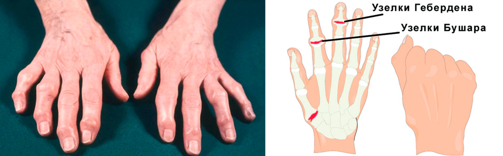 Самая частая форма артроза пальцев кисти рук. Характеризуется появлением в области пальцев костных разрастаний – узелков Гебердена и Бушара. Узелки Гебердена появляются на дистальных (более отдаленных, близких к ногтям) межфаланговых сочленениях. Их разрастание сопровождается обострением синовита: кончики пальцев болят, краснеют и отекают. Но со временем воспаление исчезает, а деформация остается.
