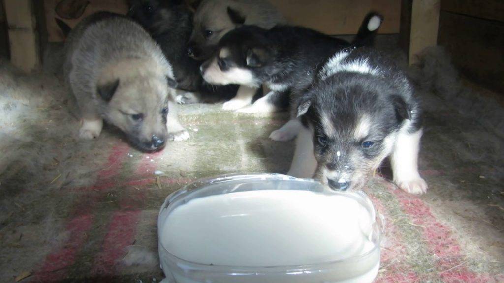 Молочные продукты. Это важнейший источник кальция, обязательно должны присутствовать в питании щенка лайки. Сначала щенки начинают получать кипяченое коровье молоко, разведенное с водой. Затем, постепенно, цельное. Обычно щенки без проблем пьют молоко и едят творог.