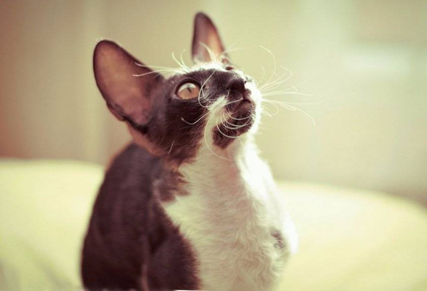 - Посадка ушей. Корниш-рексы обладают высоко посаженными ушками, девон-рексы — низко расположенными и очень большими ушами.