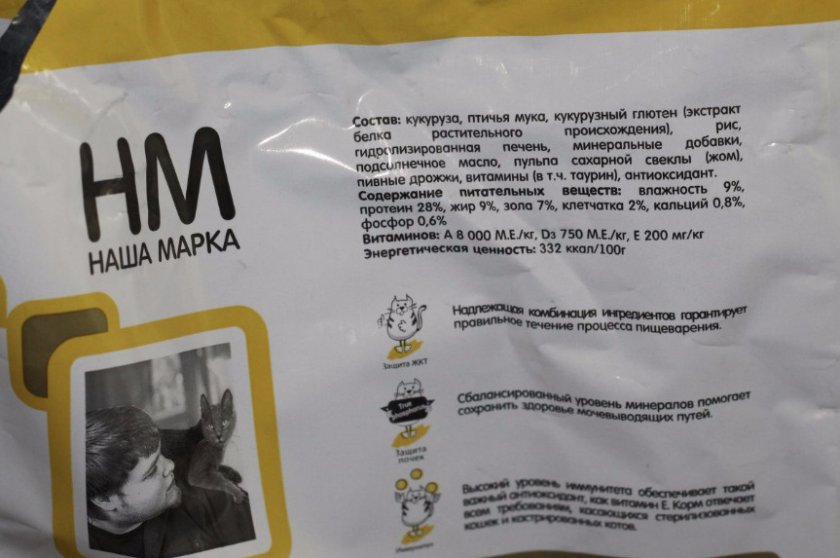 Как утверждает производитель, перевариваемая клетчатка, входящая в состав корма, улучает процесс пищеварения, что способствует его правильному течению, а также помогает усвоению питательных веществ. Кроме того, в списке компонентов сухого корма «Наша Марка» для кошек можно заметить таурин. Он оказывает положительное воздействие на зрение. Витамин Е — это природный антиоксидант, который способствует укреплению иммунной системы.