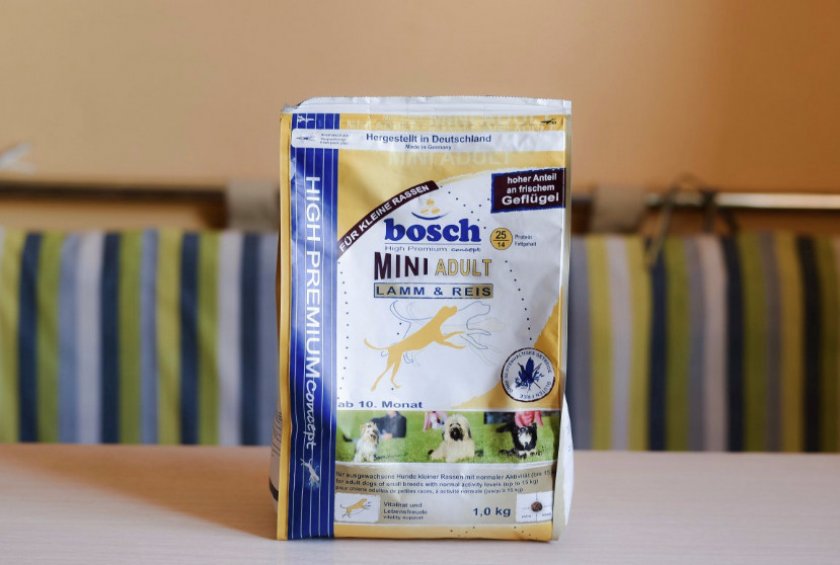 - Bosch Mini Adult — продукция для питомцев, вес которых колеблется от 5 до 15 кг. На прилавках магазинов можно встретить два варианта вкуса: ягненок и рис или птица и просо.