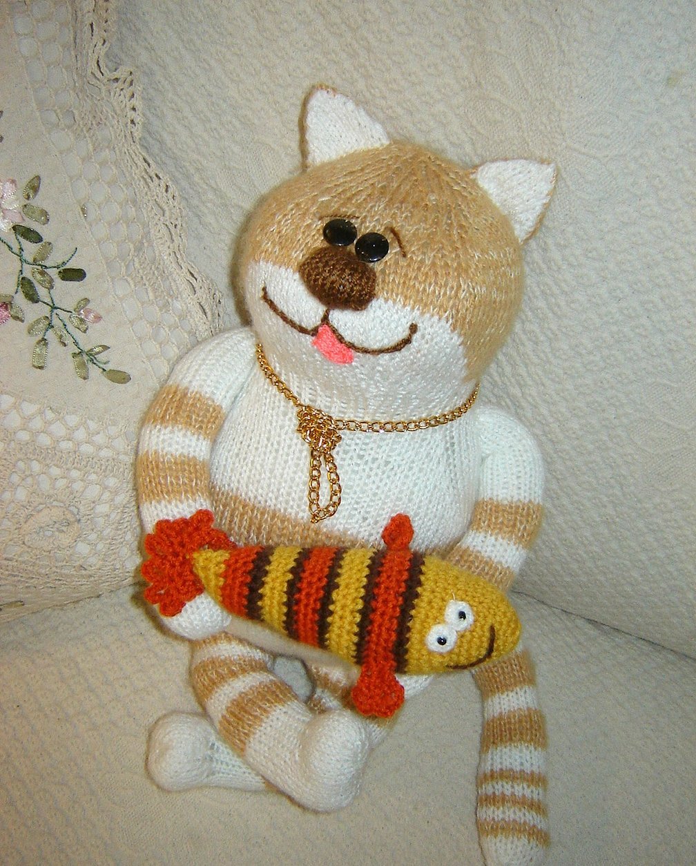 - Кот-рыболов. Самый простой вариант. Понадобится две выкройки: тело с лапками и ушками и рыбка. Хвост и мордочку оформляют нитками мулине. Для удочки подойдёт спица или палочка для роллов, леска из нитки.