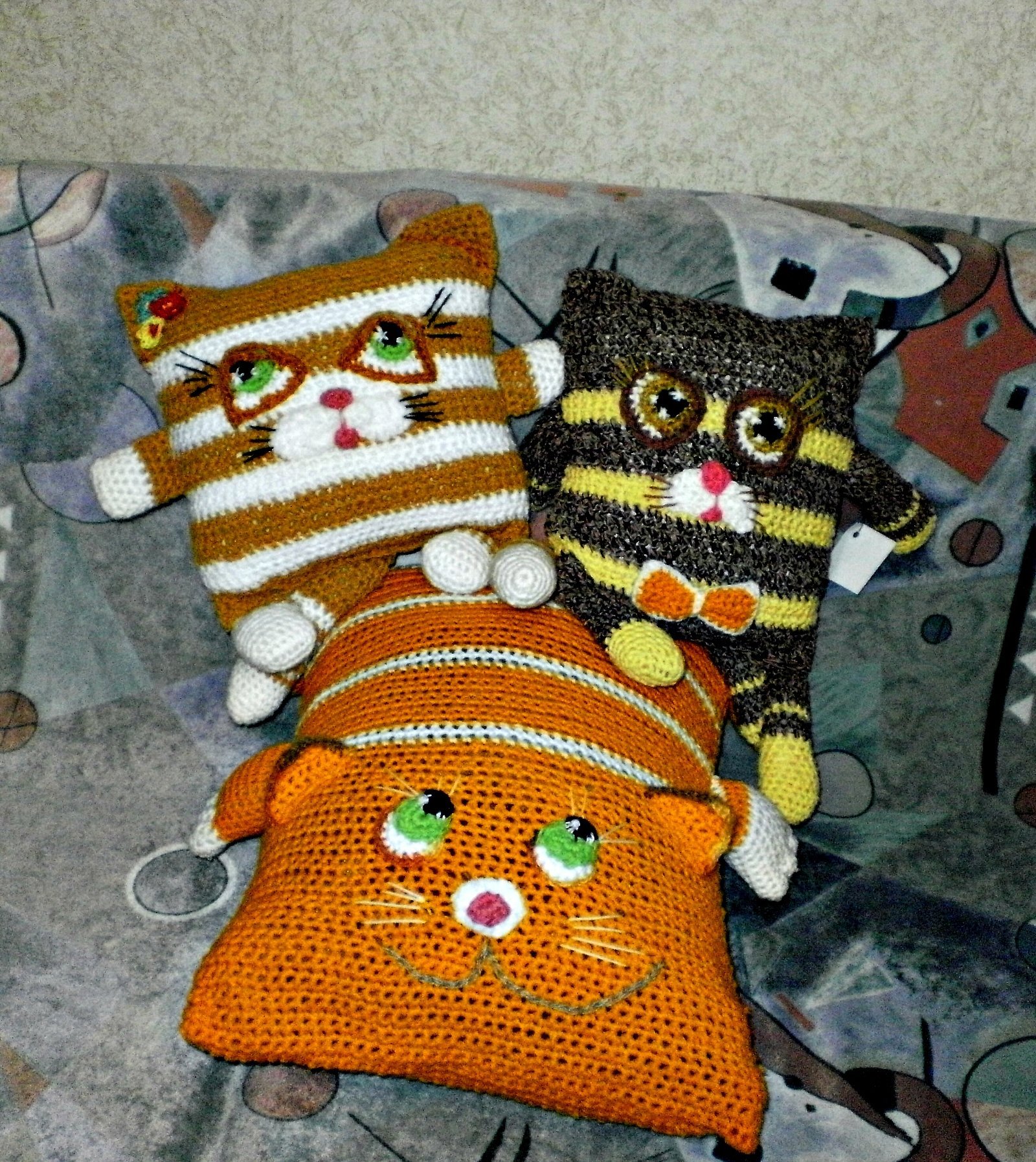 Также подушку можно связать – при помощи крючка или спиц. Если для создания кота используются спицы, то вяжется либо два квадрата, либо прямоугольник, который впоследствии складывается пополам. Не рекомендуется брать слишком толстые спицы, т. к. полотно получится рыхлым, и наполнитель будет виден сквозь него. Лучше использовать спицы средней толщины. Цвет ниток может быть любым, можно комбинировать несколько оттенков. Вязание таких подушек отлично подходит для «утилизации» скопившихся остатков клубков.